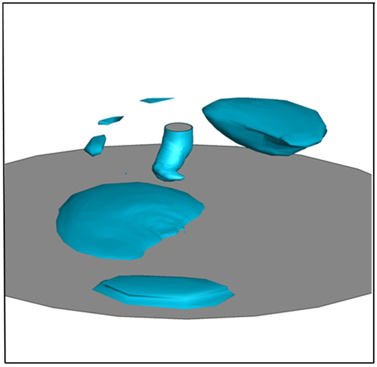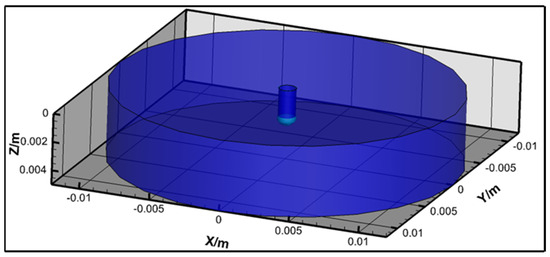 Figure 10 shows a schematic diagram of the 3D calculation domain with a column with a diameter of 24 mm. The mild steel wire had an initial length of 2 mm and a diameter of 1.2 mm, with an arc length of 3 mm. The metal and gas inlets were located at the top of the domain, while the sides serve as gas pressure outlets. The bottom boundary functions as the ground wall, set to an electric potential (Φ) of 0 and a temperature of 3000 K, as specified.