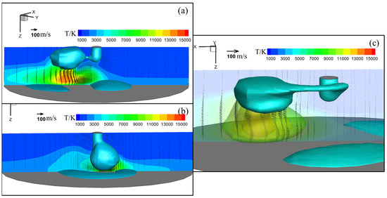 Figure 11 shows arc temperature and velocity fields for (a) conventional CO2 arc welding and MFDs of (b) 2 mT and (c) 4 mT in gas phase immediately before detachment. The metal transfer modes and their characteristics were consistent with the experimental results. The maximal arc temperature immediately before detachment varied depending on the application of LMF and the magnitude of MFD. Without LMF, the maximal arc temperature reached approximately 16,000 K, with the highest-temperature region located under the offset droplet bottom due to the outward arc flow with maximal value of 80 m. When an MFD of 2 mT was applied, the maximal arc temperature decreased to around 15,000 K, and the highest region of temperature shifted to the region under the droplet bottom around the wire axis, differing significantly from the no-LMF condition. While the maximal arc velocity was the same 80 m as that without the LMF. However, under an MFD of 4 mT, the maximal arc temperature returned to about 16,000 K, located directly under the droplet bottom, and the maximal arc velocity reached 130 m at the moment of detachment.