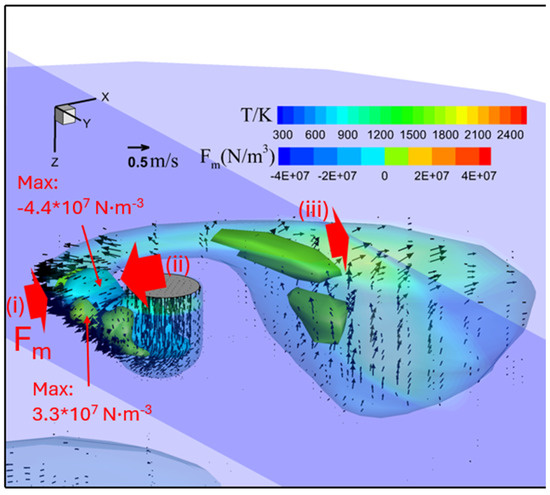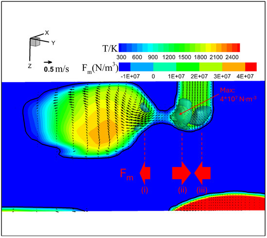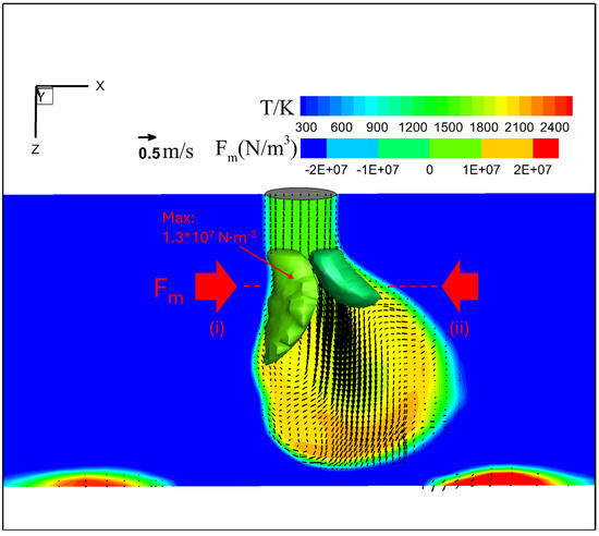 Figure 14 shows the temperature, velocity, and Lorentz force (a horizontal component parallel to the presented plane depicted as 3D iso-surfaces) fields in metal phase immediately before droplet detachment for an MDF of 2 mT. The temperature reached a maximum value of about 2400 K under the droplet. The Lorentz force acted symmetrically on both sides of the neck. The maximal Lorentz force in the direction from left to right (i) reduced significantly to approximately 1.3 × 107 N·m−3, almost matching the force in the opposite direction (ii), causing the downward flow along with the droplet central axis with the maximal velocity to be 0.70 m. This balanced force field shifted the position of droplet formation from off-axis to on-axis.