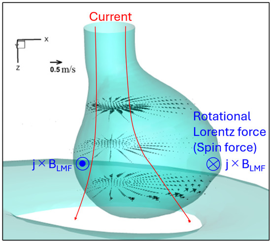 Additionally, the spin force—the rotational Lorentz force to the wire axis expressed by cross-product of the arc current density and LMF vectors—caused both the arc and molten metal inside the droplet to rotate counterclockwise.