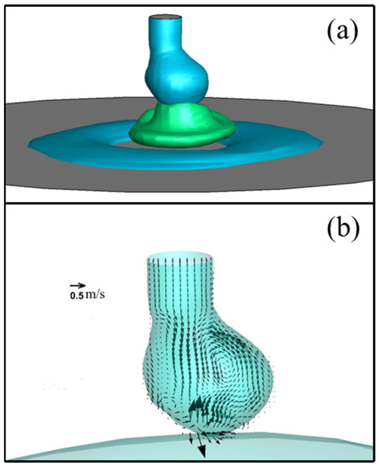 Figure 13 shows the spatter formation and molten metal velocity right after droplet detachment. It indicated that some spatters appeared when the droplet detached. The high-velocity region of molten metal was concentrated horizontally at the wire tip, from left to right.