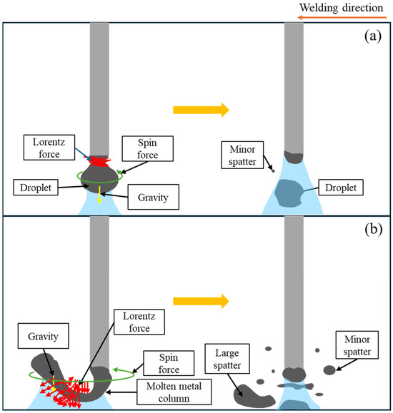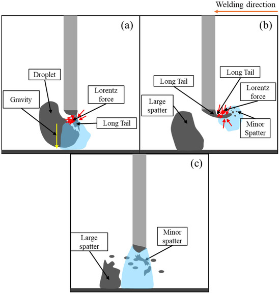 Figure 19 illustrates two stages of spatter formation in the repelled transfer mode according to our suggestion. In the first stage, due to the formation of the curved long tail, the magnetic fields on either side of it differed significantly, creating an imbalance in the Lorentz force in opposite directions. This imbalanced force strongly pushes both the tail and droplet from the side with a larger magnetic field to that with a smaller magnetic field, generating spatters during droplet detachment (Figure 19a,b). In the second stage, the strong Lorentz force elevated the long tail to a high position near the wire tip. At this position, the difference in magnetic field was formed in the opposite direction to that in the first stage, causing another imbalance in the Lorentz force. This made the molten tail move back toward the droplet, thus coming into contact with it. This contact led to a short circuit, causing an explosion of both the droplet and the tail (Figure 19c). The droplet moved out of the weld pool, resulting in a large spatter, accompanied by smaller spatters from the tail.