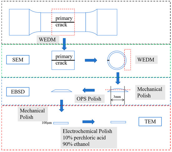After the tests, the specimens were treated by wire-cut electrical discharge machining (WEDM) and polishing, after which the specimens were subjected to various types of advanced microscopic characterization. Scanning electron microscopes (SEM, Hitachi-S4800, Tokyo, Japan) were used to characterize the surface morphology and fracture morphology, and oxidation behaviors of the specimen surfaces were discussed. Specimens were polished using sandpaper and Al2O3 oxide polishing suspension (OPS). Then, electron back scatter diffraction (EBSD, TEAM™ Pegasus, EDAX, Pleasanton, CA, USA) was used to determine the crystal orientation and local dislocation distribution, with shooting parameters of 26 kV with 2.6 nA. In addition, dislocation sub-structures were observed using a transmission electron microscope (TEM, FEI Tecnai G2-F30, Hillsboro, OR, USA) operating at 300 kV. The flakes used for TEM observation were mechanically polished using progressively increasing amounts of sandpaper with abrasive paste until the thickness was 100 μm. Afterwards, electrolytic polishing was carried out in a perchloric acid-ethanol solution at a concentration of 10% at 35 V and −30 °C. The samples used for EBSD and TEM characterization were sectioned parallel to the sample axis, as shown in Figure 2.