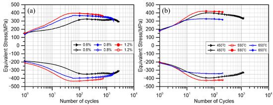 All experiments were stopped after significant cracks (3 mm or more) appeared and the cracks did not occur at the thermocouple welding spot. Figure 4 shows the results of all experiments. As shown in Figure 4, most experiments follow the process of cyclic hardening, followed by cyclic softening, and finally by failure. At a strain amplitude of 0.6% in the thermal test, a secondary hardening phenomenon appeared in the cyclic stress, which had also been reported in previous thermal fatigue studies of the material and explained as the result of plane slip under small deformation values [37]. Through the results of the constant temperature test, it can be clearly seen that with the same load of 1.2%, the test life at 550 °C and 650 °C is very close, but the cyclic stress of the former is significantly higher than that of the latter, even higher than the test at lower temperatures (450 °C).