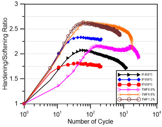 The hardening/softening relationship of the material during cyclic deformation was calculated as shown in Figure 5, where the peak stress of each cycle was divided by the peak stress of the first cycle of the test to obtain the hardening/softening rate of each test over the full life course. As can be seen in Figure 5, the hardening rate in the hardening phase of the IF test at 550 °C is significantly higher and similar to that of the TMF test.