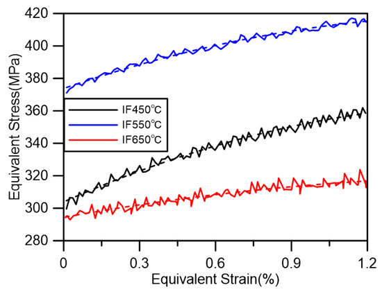 Under IF conditions, it can be seen that the frictional stresses at 550 °C and 650 °C are significantly higher than the test results at 450 °C. Previous studies have pointed out that there is a significant positive correlation between friction stress and DSA [3]. This suggests that a stronger DSA phenomenon occurs in the material at 550 °C and 650 °C, resulting in higher friction stresses compared to those at 450 °C. The back stress is affected by the overall deformation coordination property of the material, which should normally decrease gradually with the same load as the temperature increases and the material softens leading to enhanced deformation coordination property [55,56,57]. However, in the IF550 °C test, the back stress at 550 °C was significantly increased, which was similar to the experimental result at 450 °C. This is because the frequent and intense DSA at this temperature leads to an increase in the material dislocation density, an increase in the deformation resistance of the specimen, and a corresponding increase in the back stress. At 650 °C, in addition to the higher deformation coordination capacity due to the temperature increase, the thermal recovery effect at higher temperature is also applied. Due to the lower fault energy of the FCC layer, there is basically no cross-slip under the lower temperature condition (450 °C). With the temperature increase, the material layer fault energy increases, the number of cross-slip increases, the dislocations of different slip surfaces of different numbers eliminate each other, and the overall dislocation density of the material decreases, which leads to a significant decrease in the growth rate of the backs tress of the material, which is much lower than that of other experiments. At the same time, the lower growth in back stress also makes the overall stress response of the material at 650 °C significantly lower than that of the other two groups of tests with the same amplitude.
