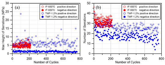 As illustrated in Figure 7, the IF 550 °C test and the TMF 1.2% test were selected for comparison. The loading rate and strain amplitude of these two tests were identical, with the difference only being that one test was at a constant 550 °C while the other was at 350–550 °C. It can be found that under the IF test, the number of serrations appearing in the positive and negative directions is basically the same, and the maximum value of the serrations in each cycle is also basically the same, while under the TMF condition, since the negative direction is the range of the temperature decreasing, it can be seen that the number of serrations decreases significantly, and there is a significant difference in the maximum height of the serrations. This is due to the fact that the mechanism of DSA formation changes as the temperature increases. In the temperature range of 350~450 °C, the occurrence of DSA is mainly interstitial solid solution atoms and dislocations occurring pinning, and with the increase in temperature, this type of DSA will be suppressed or even completely disappeared [1,2]. According to the results of Hong`s test [49], the DSA of the 316LN material is not obvious in the range of 350 °C. When the temperature continues to rise above 450 °C, the replacement solid solution atoms (Cr, Mn, etc.) will be pinned with the movable dislocations, and the DSA phenomenon of the material will reappear and become more obvious.