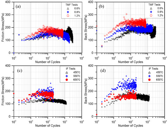 (a) Friction stress of TMF tests. (b) Back stress of TMF tests. (c) Friction stress of IF tests. (d) Back stress of IF tests.