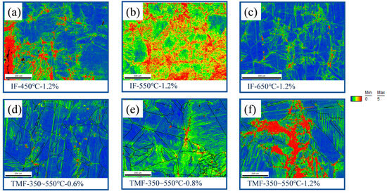 (a) KAM results of tests under IF-450 °C-1.2%. (b) KAM results of tests under IF-550 °C-1.2%. (c) KAM results of tests under IF-650 °C-1.2%. (d) KAM results of tests under TMFF-350~550 °C-0.6%. (e) KAM results of tests under TMFF-350~550 °C-0.8%. (f) KAM results of tests underTMFF-350~550 °C-1.2%. The color from blue to red in the picture indicates a gradual increase in the KAM value of the location.