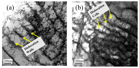 Under the combined effect of different combinations of temperature and strain conditions, the material tends to exhibit different dislocation states internally. The specimens at 550 °C and 650 °C were subjected to TEM characterization and the mapping result is shown in Figure 12.