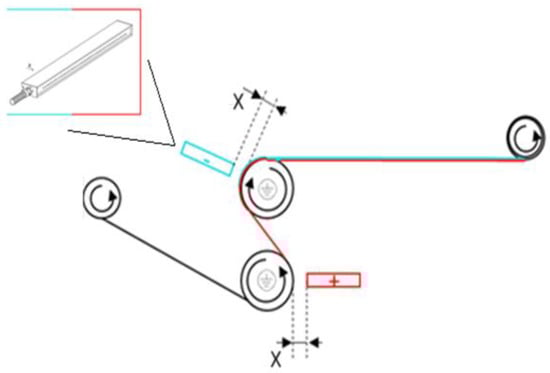 A “KNH 340” high-voltage generator (max. 30 kV, DC) of Eltex Elektrostatik GmbH (Weil am Rhein, Germany) was used to generate the required high voltage and applied to the fabrics by two electrodes “R131A” with a width of 0.50 m, also (Eltex Elektrostatik GmbH; Weil am Rhein, Germany), were connected to it. The strength of the applied electric field is determined by the distance “X” (Figure 3) between the electrodes and the earthed rollers and the set high voltage. To increase the electret effect, the conveying speed of the material was also reduced to a minimum (0.6 m min–1). Each fabric was loaded with an electrode voltage of +30 kV and accordingly, −30 kV (potential difference = 60 kV) using a roller electrode distance of 35 mm.
