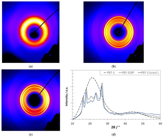 X-Ray images of the PEF samples: (a) diffraction image of PEF-1 as synthesized, (b) diffraction image of PEF1SSP, (c) diffraction image of PEF-2 (crystallized), and (d) corresponding X-Ray patterns.