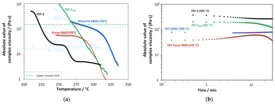 Shear rheological characterization of black PEF-11SSP, green PEF-2, blue PET reference, and red PBT reference: (a) temperature sweeps (ω = 10 rad s−1, ε = 10%, = 2 K min−1) for the determination of the process temperature windows (dotted line: min. process temperature) and (b) time sweeps at relevant temperatures for processing (ε = 10%, ω = 10 rad s−1) for the estimation of thermal degradation behavior under shear.