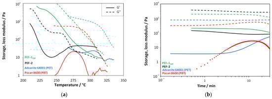 Plot of storage (G′) and loss modulus (G″) of the used polymers obtained from shear rheological characterization; black: PEF-1SSP; brown: PEF-2; blue: PET Advanite 64001; red: PBT Pocan B600: (a) temperature sweeps (ω = 10 rad s–1, ε = 10%, = 2 K min–1) and (b) time sweeps at relevant temperatures for processing (ε = 10%, ω = 10 rad s–1).