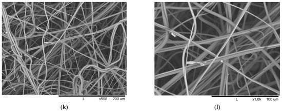 The fiber diameter distribution was determined using scanning electron microscopy (SEM). A round sample was punched out of the nonwoven and placed on the SEM carrier, sputtered in an argon plasma (40 s under a vacuum of 0.1 mbar, with a distance of 35 mm, a current of 33 mA, and a voltage of 280 V) using a “Union SCD 040” of Balzers Union Ltd. (Balzers, Liechtenstein) with a gold–palladium layer of 10–15 nm. Three SEM micrographs per sample were taken with a magnification of ×1000 using a “TM–1000 tabletop electron microscope” of Hitachi High-Tech Corporation (Tokyo, Japan) with an accelerating voltage of 15 kV in the “charge-up reduction mode”. The magnification was chosen to catch around 40 single fibers per image. Contrast and brightness were adjusted to gain an image of straight monochromic fibers in front of a dark monochrome background. To analyze the images with regards to automated fiber diameter distribution, the beta software “MAVIfiber2d” of Fraunhofer ITWM (Kaiserslautern, Germany) was applied [39]. First, the images were smoothed by an algorithm and binarized by the software before statistical analysis was performed over each fiber pixel without segmentation into individual fibers [40,41]. After merging the output of the three images, the mean and median fiber diameter as well as the standard deviation and interquartile range were determined.