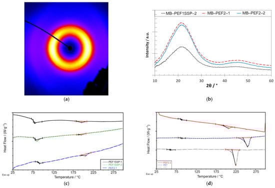 The discrepancies between DSC and WAXS signals for highly stretched PEF (e.g., MB–PEF2–2) are attributable to its slow crystallization. Consequently, the fibers are characterized by highly oriented polymer chains in the fiber axis direction (amorphous orientation) and a low amount of probably small, stress-/strain-induced crystals. These crystals are insufficient to interact with the X-Ray signal but consume energy during DSC melting. A similar XRD limitation to determine low crystallinities below 10% has been previously reported [63]. Here, it was shown that the weak crystalline reflections are submerged in scattering from the amorphous fraction.