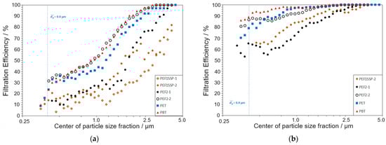 The evaluation of the investigations includes FE0.4µm, the filtration efficiency up to the particle size 0.4 µm (≤0.4 µm corresponds to the MPPS (most penetrating particle size)), and FEtot, the total filtration efficiency over the particle size range 0.2–4.0 µm (see Equation (4)).