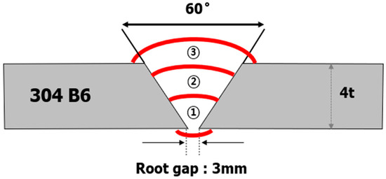 In this study, three types of filler wires (ER308L, ER309L, and ER310) were employed to manufacture welding specimens with GTA welds applied to boron-containing stainless steel, which is an ASTM A887 Grade A Type 304B6 material. The compositions of the base metal (BM) and filler wires used in this study were analyzed by quantitative analysis of electron probe microanalysis (EPMA) and are shown in Table 1. It should be noted that the composition of each filler wire did not include boron, and the Cr content increased from ER308L to ER310. As for the welding conditions, as shown in Figure 1, only the first layer was subjected to a pulsed current to control the amount of heat input, and the same conditions were applied to the three types of filler wires. The detailed welding conditions are listed in Table 2.