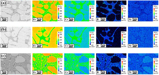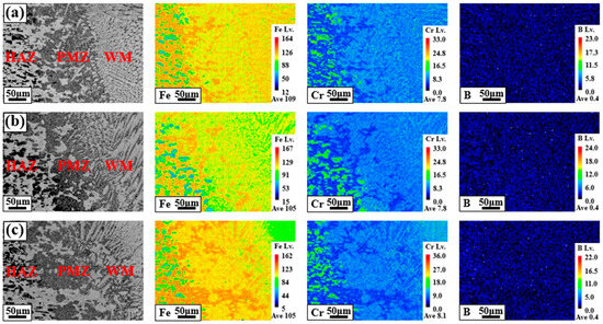 Figure 3 shows the main component segregation behaviors of each region [heat-affected zone (HAZ)/partially melted zone (PMZ)/WM] in the BSS welds using various filler wires. The Fe, Cr, and B components, which are the main components of each region of the BSS welds, were analyzed at a low magnification (×300). In the mapping results in Figure 3a–c, the left side corresponds to the area close to the HAZ, the center to the PMZ, and the right side to the WM. In the HAZ, a microstructure composed of a matrix and irregularly shaped particles was observed. The particles were highly enriched with Cr and B compared to the matrix, whereas the Fe component was mainly concentrated in the matrix. The color difference between the Cr and Fe components in the HAZ was more pronounced than that in the PMZ and WM, indicating significant segregation. As a result of evaluating the characteristics of BSS in a previous study, which had low corrosion resistance due to consuming the Cr component in the matrix and precipitating boride [20], it was found that the relatively dark particles in the HAZ were borides composed of Fe–Cr–B. When the WM reached the PMZ, the irregular borides in the HAZ disappeared, and these results were also confirmed in the mapping analysis results. In addition, although B components were not added to all the filler wires, as shown in Table 2, B components were observed in the PMZ and WMs of all welds. This is because the B components in the HAZ were diluted in the FZ owing to the welding heat during the welding process.