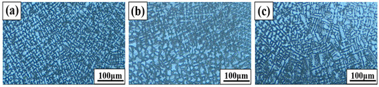 Figure 2 shows the results of observing the microstructure of the BSS weld metals (WMs) using various filler wires. All weld metals were re-dissolved, and solidified areas were observed as two phases consisting of austenite dendrites and interdendritic regions formed by the eutectic reaction. A dendrite is formed when the molten WM begins to solidify owing to the high temperature during the welding process. After the initial solidification nucleus was created, it grew from the fusion line toward the center of the WM, preferentially forming primary dendrites. When this primary dendrite grows, smaller branches begin to form along the direction in which the heat escapes from the surrounding area; these branches are called secondary dendrites [18]. As the preceding branches grow preferentially, the temperature gradient decreases, and the remaining liquid metal cools uniformly in various directions in an increasingly narrow space, forming an equiaxed dendrite [19]. Secondary dendrite arm spacing (SDAS) refers to the spacing between secondary dendrites, which has a substantial effect on the mechanical properties. In general, the smaller the gap, the more it acts as a fine-grain boundary, thereby improving the strength and hardness [20,21]. The interdendritic region formed through a eutectic reaction starts to nucleate and grow simultaneously at the same time as dendrites in the liquid weld pool. The interdendritic regions of all the WMs using the three types of filler wires were formed in a very fine and continuous network-like distribution owing to the high cooling rate. The phase fraction and size of each WM were different, but the same microstructure was formed in all WMs.