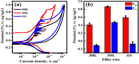 (a) Cyclic polarization curves of BSS WMs using various filler wires measured in 50 ppm NaCl solution, at 27 °C, and with potential sweep rate of 0.167 mVs−1. (b) Pitting and repassivation potential (Epit and Erp, respectively) of WM along the filler wire measured through the cyclic polarization curve.