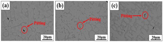 Figure 6 shows the pitting corrosion sensitivity measurement results for the BSS WMs using various filler wires. As shown in Figure 6a, general corrosion occurred on the 308L WM surface, revealing an overall dendritic structure. In addition, multiple large pits are observed, confirming the occurrence of pitting corrosion. However, as shown in Figure 6b,c, general corrosion did not occur, and the pit morphology was relatively small. The pitting corrosion resistance of stainless steel is generally assessed using the pitting resistance equivalent number (PREN), as shown in Equation (1):