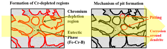 Figure 9 shows a schematic diagram showing the pit formation location formed after cyclic polarization testing. In the ID region, which includes the eutectic reaction, the Cr component was concentrated and segregated. However, at the interface between the ID region and the dendrite, a Cr-depleted region was formed, leading to a specific area where the corrosion characteristics deteriorated. Therefore, the results shown in Figure 8 confirmed that the pits formed during the cyclic polarization experiment occurred either in the ID region, including the interface between dendrites, or at the location of the dendrite adjacent to the Cr-depleted region. The location where pits are formed is clearly shown in the schematic diagram in Figure 9, and the corrosion mechanism of BSS welds can be elucidated.