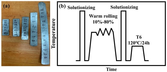 The materials used in this study were homogenized at 420 °C for 10 h and 470 °C for 24 h immediately after semi-continuous casting, and their chemical composition is shown in Table 1. The plates used in the test were taken from the middle of the homogenized bar and had dimensions of 10 mm × 50 mm × 70 mm. Figure 1b shows a schematic diagram of the short-flow TMT process. All plates were quenched immediately after solutionizing at 475 °C for 2 h. Afterwards, the plates were rolled with a deformation degree of up to 80% at 300 °C (as shown in Figure 1a). The specific process of rolling was as follows: First, the sample was kept in a furnace at 300 °C for 30 min; next, segmented rolling was carried out with deformation amounts of 10%, 10%, 20%, 20%, and 20%. The sample was returned to the furnace for insulation for 5 min between each rolling pass. All plates were solutionized (475 °C/2 h) and peak-aged (T6: 120 °C/24 h) after the final rolling process. The insulation during the rolling process and solid solution were carried out using aluminum alloy heat treatment furnace (Muffle furnace RX-650-25, Changsha, China). Its rated power, maximum heating temperature, and effective heating chamber size were 25 KW, 650 °C, and 400 mm * 300 mm * 300 mm, respectively. The diameters of the upper and lower rollers of the rolling mill were the same, at Φ100 mm. The maximum rolling pressure was 200 kN, and the roll speed was constant at 20 r/min. The applicable temperature range for the aging furnace (WGL-65D) was 10 °C to 300 °C, with a rated power of 1.6 kW and a temperature fluctuation of ±1 °C.