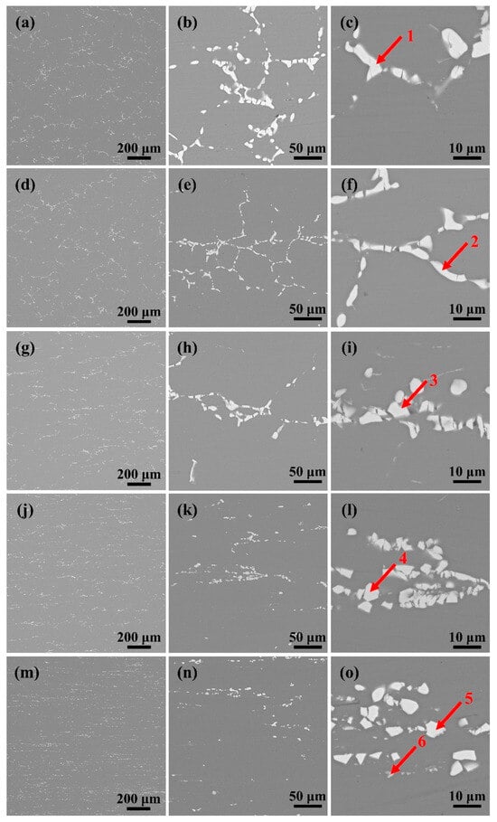 Distribution of the second phase of plates with different percentages of reduction after solution: (a–c) 10%; (d–f) 20%; (g–i) 40%; (j–l) 60%; (m–o) 80%.