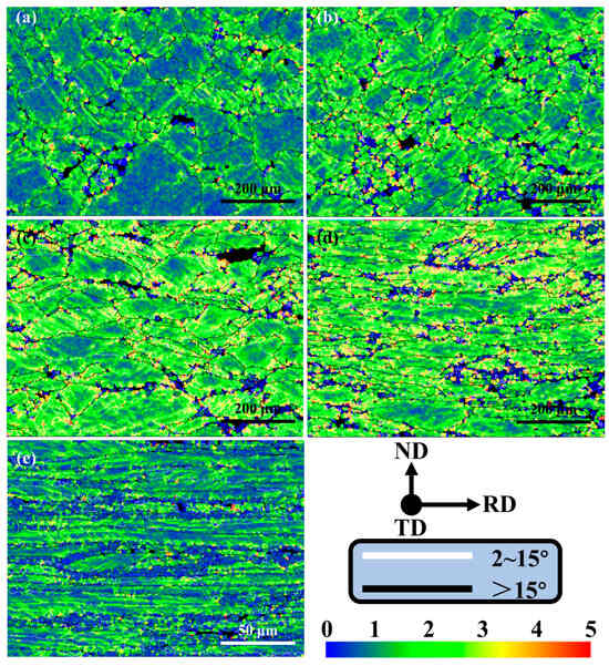 As the rolling reduction increases from 10% to 60%, the proportions of green, yellow, and red increase (Figure 6a–d). It can be observed that the peaks in the local misorientation diagram are gradually shifting to higher angles (Figure 7a–d), and the statistical results show that the average value increases from 1.16 to 1.90 (Figure 7f). When the reduction continues to increase to 80%, the KAM map generally returns to the blue-green distribution (Figure 6e), and the statistical results also show that the average local misorientation decreases to 1.09 (Figure 7e,f). This indicates that the dislocations accumulated in the rolling process undergo a more complete recrystallization during the solid solution process, and transform into more fine recrystallized grains with low dislocation density. Therefore, it can be considered that when the deformation reduction is less than 60%, the alloy is mainly based on the recovery mechanism. When the deformation reduction exceeds 80%, recrystallization is the main mechanism.
