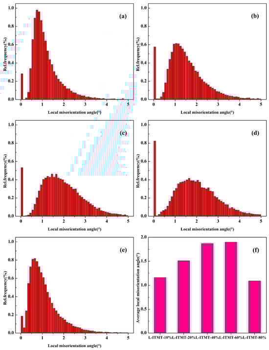 Local misorientation distribution after solid solution with different percentages of rolling reduction: (a) 10%; (b) 20%; (c) 40%; (d) 60%; (e) 80%. (f) Average local misorientation.