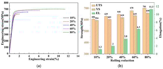 Figure 8a,b shows the stress–strain curves and corresponding mechanical properties of the final state under different degrees of deformation in the L-ITMT process. During the process of increasing the deformation degree from 10% to 20%, the ultimate tensile strength (UTS) of the board increased from 606 MPa to 629 MPa, the yield strength (YS) increased from 594 MPa to 603 MPa, and the elongation (EL) increased significantly from 1.2% to 2.0%. Under moderate deformation levels of 40% and 60%, the comprehensive mechanical properties of the board were further improved. Their UTS values were 646 MPa and 678 MPa, their YS values were 618 MPa and 635 MPa, and their EL values were 3.8% and 6.3%, respectively. When the recrystallization mechanism underwent a transformation (as described in Section 3.3), that is, when the degree of deformation reached 80%, the UTS and YS of the alloy increased to 701 MPa and 658 MPa, respectively, while the EL increased significantly to 11.3%.