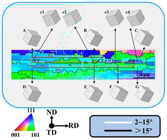 As shown in Figure 4e,f and Table 4, when the rolling reduction reached 80%, the average aspect ratio of grains reached 4.49, which meets the conditions (aspect ratio greater than 4) for GRX []. This phenomenon was observed in many areas of its microstructure, as shown in the A1~A3 area in Figure 4e. As mentioned in Section 3.1, the deformed bands with HAGBs formed by shearing were almost distributed along the RD direction at a rolling reduction of 80%. The width along the ND direction was about 2 μm (Figure 10), which is very close to the grain size of a single subgrain. The orientations of the P2 region (position A~C) and the P1 region (position D~G) were very close in terms of cubic lattice (Figure 10), and neither the point-to-point difference nor the point-to-origin difference exceeded 9° (Figure 11a,b), which indicates that both the P1 and P2 regions belonged to an original grain (named grain P). The point-to-point misorientation and point-to-origin misorientation from the D area to the A area indicate that the misorientation of C1, P1, and P2 was 60° (Figure 11c), but the orientation of all three was <123>//TD. Therefore, C1 was originally part of the deformation band formed inside the grain P. Figure 11d shows that the misorientation between C1~C4 grains was less than 10°, and it can be more clearly observed that their orientations are very close from orientations c1~c4 represented by their cubic lattice. They originally belonged to the same deformation band during the deformation process, and the grain boundaries were twisted at a small angle during the solid solution process to form new grains with close orientations. Therefore, the fine C2~C4 grains distributed along the RD direction can be considered the final result of the development of the original elongated deformation band through GRX.