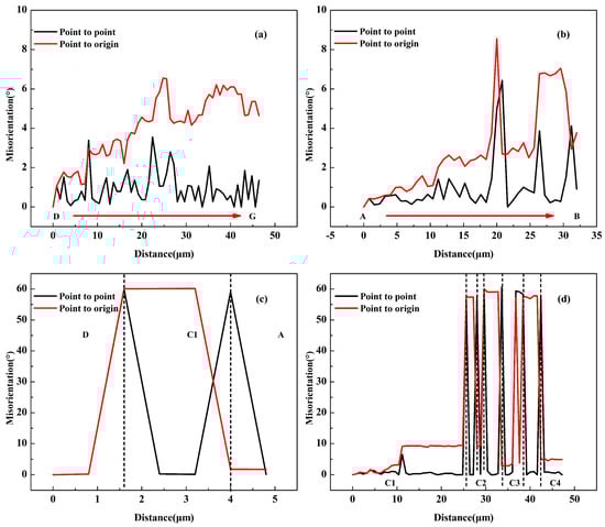 Misorientation along the arrow direction in Figure 2: (a) Area D to Area G; (b) Area A to Area B; (c) Area D to Area A; (d) Area C1 to Area C4.