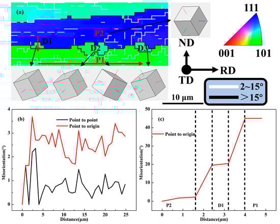 (a) Local area in Figure 5e, (b) misorientation in the direction of the red arrow inside the P1 grain, and (c) misorientation through D1 in the direction of the red arrow.