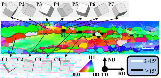 Under the condition of rolling reduction of 80%, obvious fine-grained bands were formed in the middle area of Figure 4e, while no obvious fine-grained bands were observed within 60% reduction. This indicates that the primary need for producing fine-grained bands is under high strain or high energy storage. Figure 13 shows a local enlargement of the fine-grained region in Figure 4e, where multiple coarse particles are found around the fine grain band. The cubic lattice orientation of the fine grains P1~P7 around the coarse particle S1 was quite different, which is due to the fact that the coarse particle S1 produced randomly oriented fine grains through the PSN effect during the solution process. This is one of the characteristics of formation of the fine-grained bands. On the other hand, the orientations of the C1~C4 grains distributed along the RD direction around particle S1 were not completely consistent, but their orientations were approximately <001>//TD direction. This indicates that they were formed through the twisting of deformation bands and belong to the continuous recrystallization mechanism. Coarse particles can also increase the formation rate of high angle grain boundaries by disrupting the flatness of grain boundaries and establish new high angle grain boundaries by rotating the lattice around the coarse particles. This reduces the width of the surrounding large grains or deformation bands extending in the ND direction, making narrow grains or deformation bands near the particles more prone to continuous recrystallization during the solid solution process.