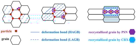 In summary, fine grain bands can be considered to be caused by the PSN effect of multiple adjacent coarse particles and the fine grains distributed in the RD direction generated by the continuous recrystallization mechanism (as shown in Figure 14).