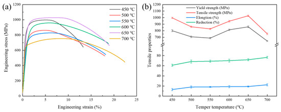 Engineering stress–strain curves (a) and tensile properties (b) of Cr-Ni-Mo-V rotor steel at various tempering temperatures.