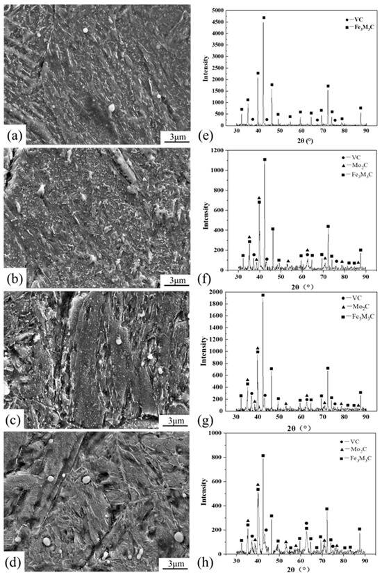 Figure 1c–e show the microstructure of Cr-Ni-Mo-V rotor steel under the annealing, normalizing and quenching processes before tempering. According to the analysis of Figure 1b, the matrix and carbides show different characteristics after annealing, normalizing and quenching due to different cooling rates. Figure 4a–d show the SEM microstructure of Cr-Ni-Mo-V rotor steel at various tempering temperatures, whereas Figure 4e–h show the carbide energy spectrum. At 450 °C, the microstructure of Cr-Ni-Mo-V rotor steel consists of martensite lath, rod-shaped Fe3Mo3C, and a minor quantity of spherical VC, as shown in Figure 4a,e. Figure 4b,f show that at 550 °C, a substantial quantity of rod-shaped Fe3Mo3C in Cr-Ni-Mo-V rotor steel is spread at the grain boundary, whereas a little amount of VC and Mo2C is dispersed within the grain. Compared to 450 °C, the amount of Fe3Mo3C increases and the diameter increases from 200 nm to 500 nm at 550 °C, and it was concluded that a large amount of Fe3Mo3C precipitated and grew. The content of Fe3Mo3C dramatically drops at 650 °C, as shown in Figure 4c,g, while a considerable quantity of VC and Mo2C disperses. Figure 4d,h show that at 700 °C the matrix’s Fe3Mo3C content decreases, VC and Mo2C coarsen and the precipitation-promoting impact on Cr-Ni-Mo-V rotor steel weakens.