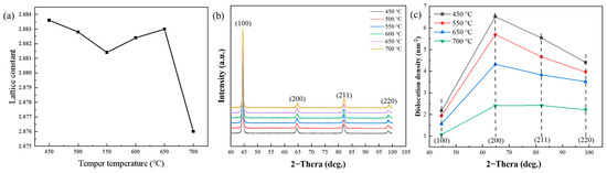 Figure 5 depicts the variations in the lattice constant of alpha-Fe, the matrix diffraction intensity and the dislocation density of Cr-Ni-Mo-V rotor steel at various tempering temperatures. Figure 5a demonstrates that the spacing of the matrix’s crystal face reduces when tempered at 450–550 °C, increases when tempered at 550–650 °C and decreases when tempered at 650–700 °C. This is consistent with the shifting trend of strength with tempering temperature (Figure 3b). The change in the crystal face spacing of the matrix also reflects the solid solution and precipitation law of alloying elements, which is also confirmed by the precipitation and resolution of Fe3Mo3C carbide in the matrix and the precipitation and coarsening of VC and Mo2C carbide in Figure 4. Figure 5b,c show the matrix diffraction strength and the dislocation density which is determined using the half-peak width of the diffraction peak at different tempering temperatures. With the tempering temperature increasing, the diffraction intensity and dislocation density decreased gradually due to the gradual recovery and recrystallization of martensite lath.