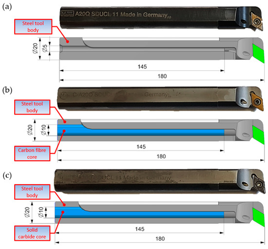 Figure 1a shows turning tool A20Q SDUCL 11, which has a monolithic construction with a central hole for the supply of coolant and lubrication. The tool is used for standard internal turning operations (boring). Its design is suitable for most materials, such as steel, stainless steel, or cast iron. The C-A20Q SDUCL 11 (Figure 1b) turning tool has a hybrid design in which a carbon fibre core with a diameter of 10 mm and a length of 145 mm is embedded in the steel tool body. The tool is fitted with a duct for feeding the coolant directly to the cutting insert, making it suitable for demanding applications such as stainless steel or titanium alloys, where high operating temperatures may affect tool durability. The cooling system allows the extension of the lifespan of the cutting insert and enhances the quality of the machined surface. Whereas the E-A20Q SDUCL 11 (Figure 1c), thanks to the steel shank in which a solid carbide core with a diameter of 10 mm and 145 mm is embedded, is dedicated to the most demanding turning operations, where high stiffness and resistance to vibrations occurring in the tool–workpiece system is necessary.