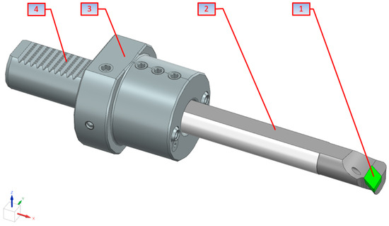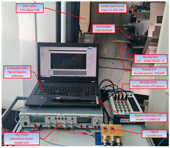 The laboratory tests were carried out on the measuring stand (Figure 3), constructed with the CTX alpha 500 lathe (DMG Mori Co., Ltd., Tortona, Italy) equipped with Sinumeric 840SL control, fitted with a 12-position radial turret manufactured by Sauter, type 0.5.901.016 (Sauter Feinmechanik GmbH, Metzingen, Germany) for the VDI 30 tool holder. Three distinct designs of boring tools manufactured by Maier GmbH have been installed in the turret with the tool holder VDIE2M3020 (Kennametal Inc., Pittsburgh, PA, USA). The tools used included the following: