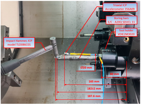 Experimental research consisted of the artificial introduction to the system of forcing in the form of an external force with the following model of a modal hammer: TLD086C01 (PCB Piezotronics) (Figure 4). Measurement of the system response on boring bars was taken with the acceleration sensor model 356A09 (Triaxial ICP Accelerometer PCB Piezotronics). The signals from the modal hammer and accelerometer were recorded using the NI USB-6259 (National Instruments) measuring card at a frequency of 10 kHz and Signal Express software (version 2015). A conditioning system consisting of low-pass filters with a cut-off frequency of 5 kHz was used to prevent aliasing in the signal sampling process. Furthermore, the conditioning system incorporated current sources that facilitated the provision of an appropriate supply to the modal hammer and accelerometer.