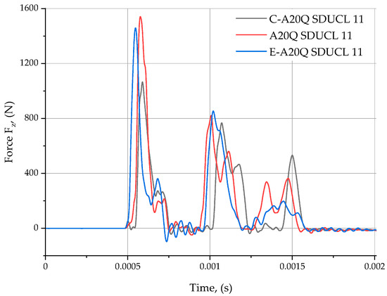 The analysis of the data presented in the graph (Figure 6) allows us to observe that in the case of the monolithic tool A20Q SDUCL 11 (red line), the force reaches the highest peak value of approximately 0.0005 s and its value is close to 1500 N. In the case of the other two measuring series, 11 (the tool with carbon fibre core C-A20Q SDUCL 11 (black line) and the tool with sintered carbide E–A20Q SDUCL 11 (blue line) also display significant peaks at a similar time; however the values are slightly lower. The lowest force value was identified in the case of a carbon-core turning tool at approximately 1050 N. The differences result from the lack of repeatability due to the manual use of a modal hammer by the operator during the tests.