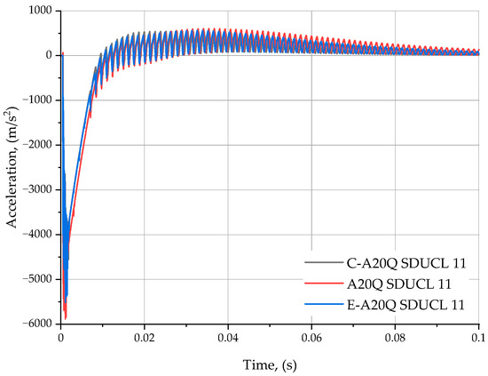 The graph of acceleration changes as a function of time (Figure 7) in the initial phase and all three waveforms reach their maximum negative acceleration values of −5500 m/s2, which indicates the action of a pulsed force opposite the Z axis of the adopted coordinate system. Moreover, an evident oscillating effect is discernible on the graph, particularly during the initial phase of the run (up to approximately 0.03 s). These oscillations are characterised by decreasing amplitude, which clearly indicates the dynamic damping process occurring in this system, and thus the dissipation of energy. After the initial and oscillating phases, the system stabilises near a value close to zero, which in turn indicates that the system reaches a state of dynamic equilibrium. The observed variations in acceleration rates for all three types of turning tools tested may be indicative of slight differences in the values of the parameters characterising each of them (e.g., weight, damping coefficient, stiffness).
