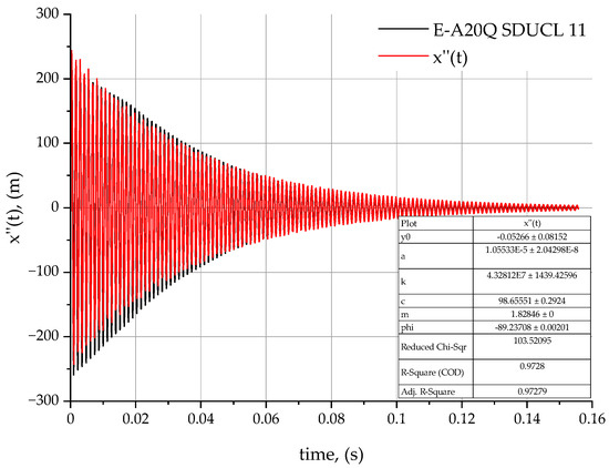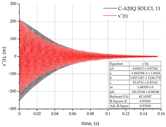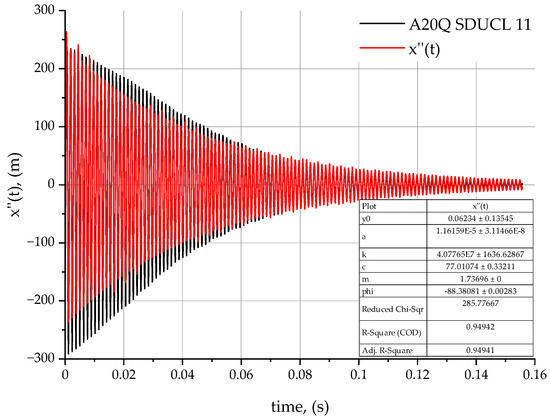 The Levenberg–Marquardt method was used for the purpose of matching the plots of the theoretical acceleration course of the vibrating tip of the tool to the results of the bench tests. This is one optimisation method, especially used to solve non-linear problems of the smallest squares, in particular in the case of matching equations with data presented in graphs [27]. The method features a synthetic merger of components of gradient and Newtonian methods, which facilitates accelerated convergence and enhanced stability. This method is primarily employed in the process of aligning non-linear models with empirical data, a process that may be applied to the calibration of parameters within a range of physical, chemical, and biological models. Literature indicates that the method is effective in complex models, particularly in cases that require precise matching of parameters such as calibration of spectroscopy in analytical models (e.g., WMS model). In such instances, it guarantees high sensitivity and resistance to changing environmental conditions [28].