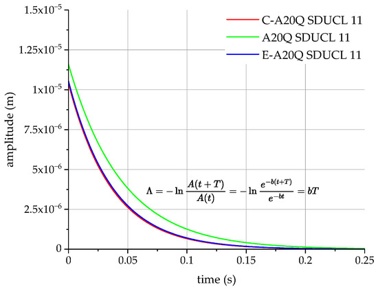 The analysis of the results obtained are based on the proposed method of determining the values of dynamic coefficients (damping c and stiffness k) for the three turning tools tested—C-A20Q SDUCL 11 (Figure 8), A20Q SDUCL 11 (Figure 9), and E-A20Q SDUCL 11 (Figure 10). These factors are fundamental to an understanding of the dynamics of mechanical systems. The damped vibration theory may prove useful for understanding the influence of the design of the turning tool on the dynamic behaviour, stability, and durability of the tool during the machining process.