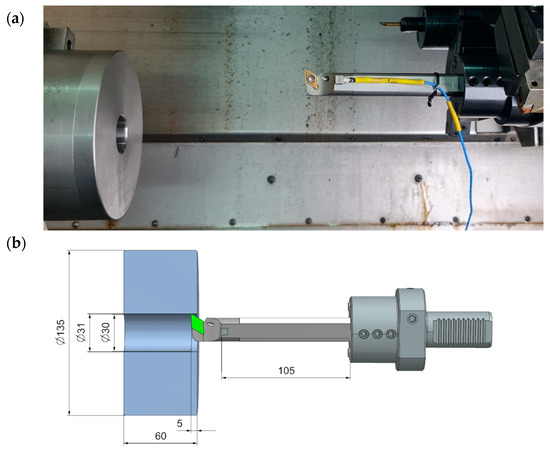 As part of the research, cutting tests were carried out without the use of coolant lubricant on a CTX ALPHA 500 turning centre from DMG Mori (Tortona, Italy). The field tests involved machining a hole with a diameter of 31 mm and a depth of 5 mm. The semi-finished part was made of S355J2 (1.0570) steel in the form of a sleeve with the following dimensions: outer diameter 135 mm, pre-hole diameter 30 mm, sample height 60 mm. A schematic of the machining process is shown in Figure 12.