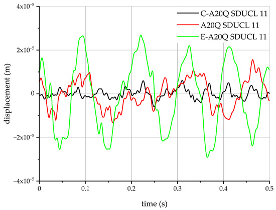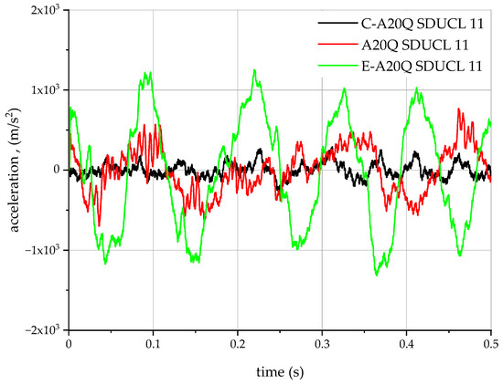 When analysing the range of vibration amplitudes, it can be observed that the tool designated C-A20Q SDUCL 11 has the smallest vibration amplitude, which is in the range of approximately ±1 × 10−5 m. For the A20Q SDUCL 11 tool, the vibration amplitude is significantly larger, oscillating in the range of approximately ±2 × 10−5 m. The largest amplitude was observed for the E-A20Q SDUCL 11 tool, reaching values close to ±3 × 10−5 m. From this analysis, it can be concluded that the C-A20Q SDUCL 11 tool has the best vibration dampening properties, which is essential for achieving high-quality machined surfaces, minimising wear on the cutting edges and increasing the overall efficiency and life of the cutting tool, thus ensuring more stable and accurate machining processes.