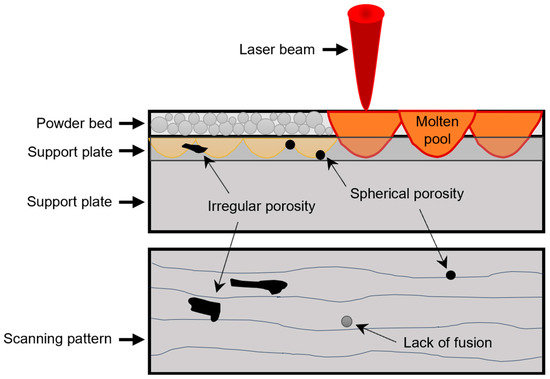Schematic representation of the laser powder bed fusion process where the different types of porosity generated can be observed: section view (top) and top view (bottom).